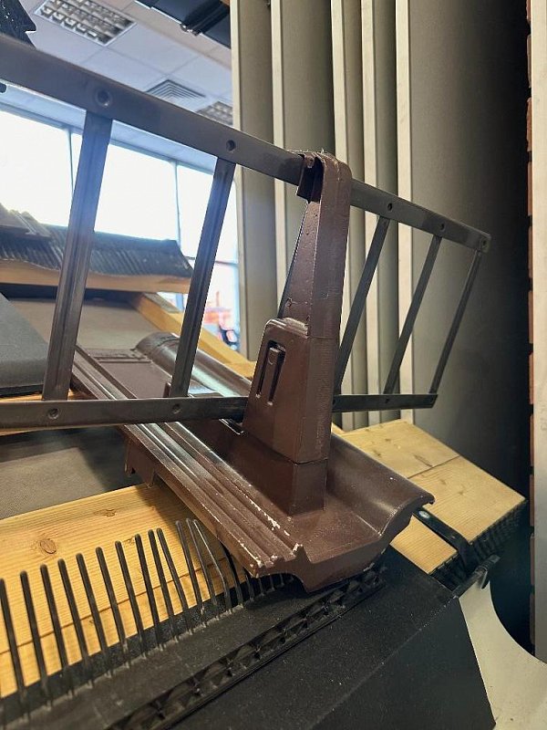 Черепица имеет специальные крепления для снегозадерживающей решетки, что упрощает процесс монтажа и обеспечивает надежное удержание снега на крыше.